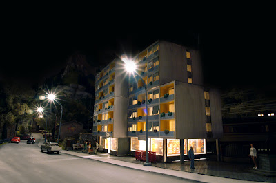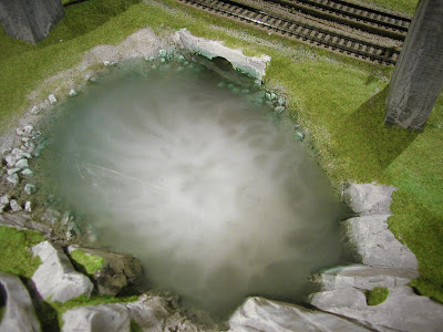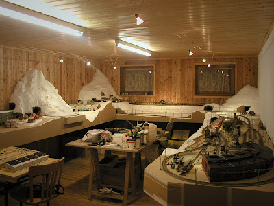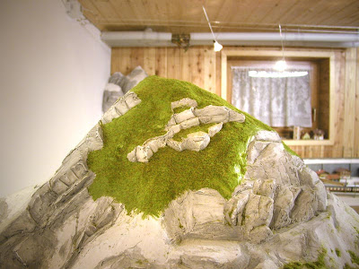 On the open frame with the tracks, styrofoam blocks were used to form the mountains. On that we put a layer of moltofill to model the rocks.